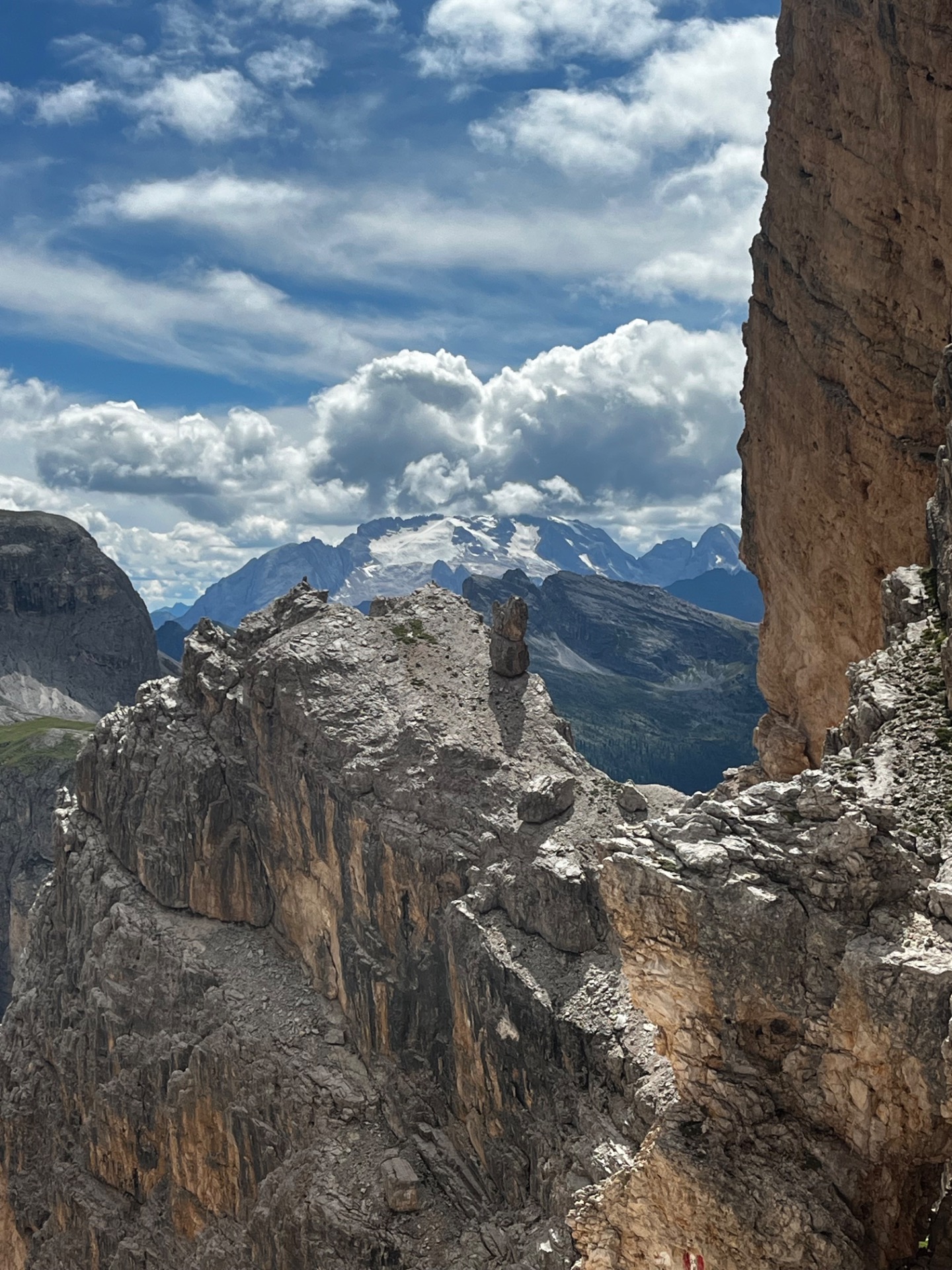 Začínáme sestupem k Passo Falzarego (2 105 m) a odtud pokračujeme přes zalesněné svahy a úchvatné skalní útvary směrem k Rifugio Nuvolau (2 575 m). Cesta nás zavede k Cinque Torri, což jsou ikonické skalní věže, které patří mezi nejfotografovanější místa v Dolomitech. Tato část trasy je plná různorodé krajiny, kde si užijete jak otevřená horská úbočí, tak nádherné horské louky.